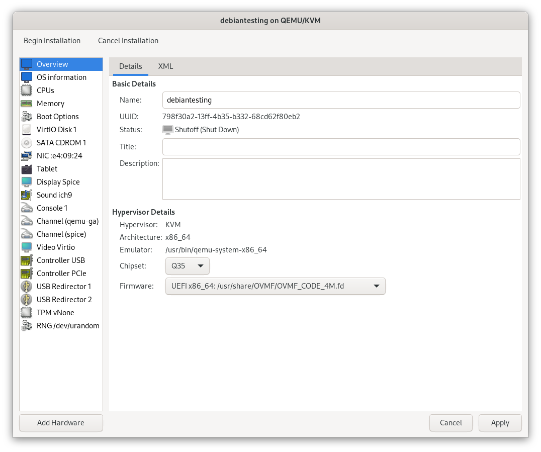 I created a virtual machine, also Debian 12, in the QEMU system session. The only important setting for now is the chipset and firmware, and in my case I selected Q35, and the OVMF UEFI firmware. GPU passthrough will not work if a virtual machine is booting with legacy BIOS.