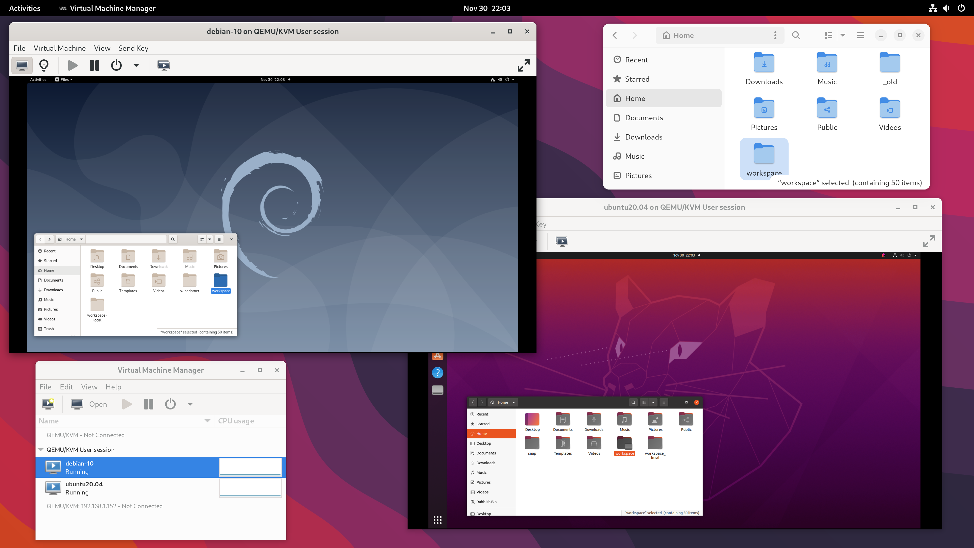 /home/mike/workspaceon the host was shared with every VM via a 9p fileshare. - Each desktop was set to 1920 x 1080 resolution, with auto-resize disabled. I kept the VM’s at this lower resolution to get acceptable graphical performance on 4K monitors when I set this up.