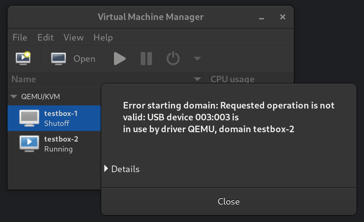 I then extended this to use an orderly shutdown, and to work with an arbitrary number of VM’s. CirrOS was not completing its boot in this environment, so I switched the test VM’s to Debian, and also passed through a USB device to each of them so that I would get an error if I ever tried to boot both VM’s simultaneously.