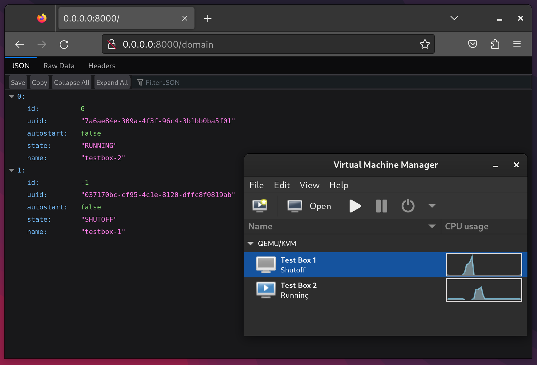 This was the first time I tried using the libvirt Python bindings before, and I was able to quickly make a script which toggled between two VM’s, which are nested within the VM I’m using for development, because of course they are.